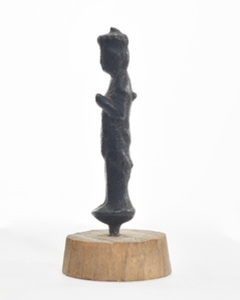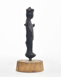 個人の家の敷地内(しきちない)にある阿弥陀堂(あみだどう)の横の池から、菩薩立像・地蔵菩薩坐像(じぞうぼさつざぞう)とともに見つかりました。三体とも小さく、お守りのように持ち歩いて使われていたと考えられています。また、三体とも火にさらされた上に、長い期間土にうまっていましたが、状態がよく保存されています。