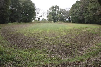 本丸の周りは、簡単に攻め込まれないように、約3mの土塁(どるい)という土の堤防(ていぼう)で囲まれ、その外側は深さ約10m、幅約8mの堀(ほり)で囲まれています。