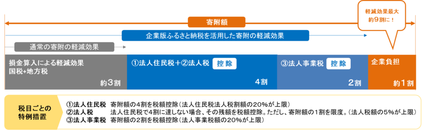 企業版ふるさと納税は、国が認定した地方公共団体の地方創生プロジェクトに対して企業が寄附を行った場合に、法人関係税から税額控除する仕組みです。損金算入による軽減効果と合わせて、最大で寄附の約9割の税の軽減効果があります。