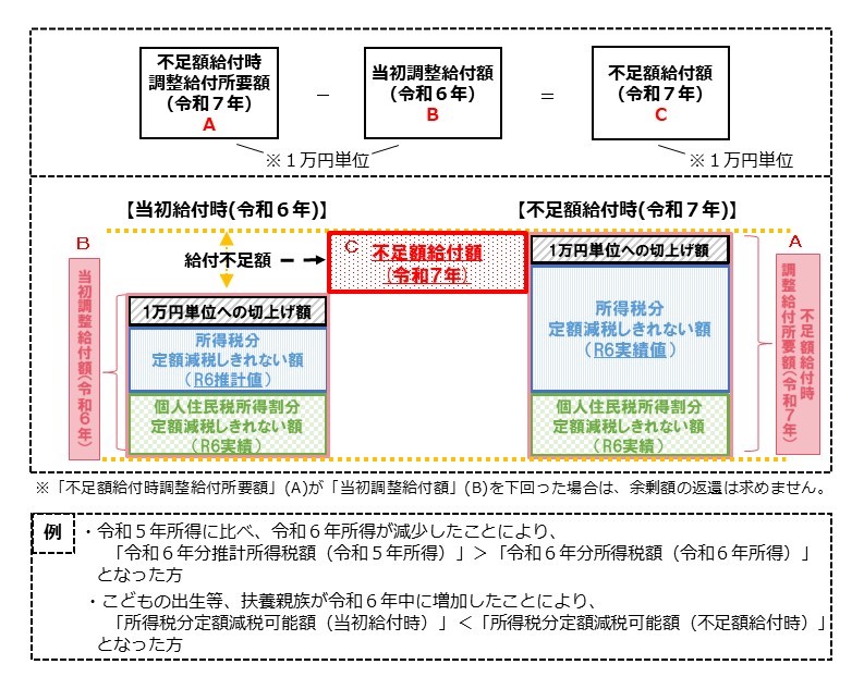 令和6年度に定額減税しきれないと見込まれる方を対象に、調整給付金(当初調整給付)を支給しました。その際、令和5年所得等をもとにした推計額(令和6年分推計所得税額)を用いて算出したことにより、支給額に不足が生じた方などに対して、不足分を支給するものです。