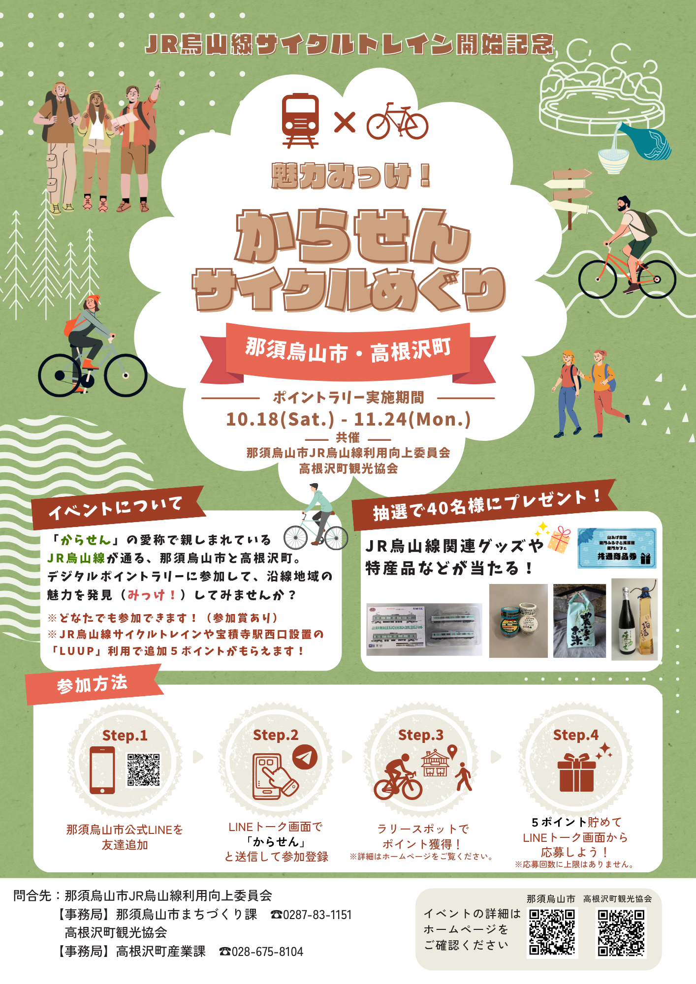 JR烏山線サイクルトレインの開始を記念し、JR烏山線沿線の魅力発信およびJR烏山線利用向上を目的とした、デジタルポイントラリーを開催します!