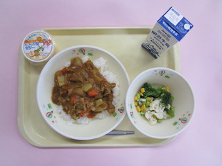 11月14日~地産地消ウイーク~ ご飯 牛乳 大豆入りひき肉カレー 干ぴょうサラダ みかん |
