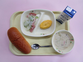 11月11日~地産地消ウイーク~ 牛乳パン 牛乳 鶏肉のハーブ焼き さつま芋のサラダ かぼちゃのスープ 県産ヨーグルト |