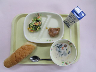 4月17日牛乳パン 牛乳 照焼きチキン コーンとブロッコリーのサラダ マカロニのクリーム煮 |