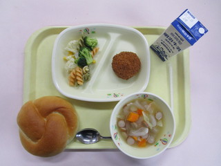 4月19日米粉パン 牛乳 メンチカツ マカロニイタリアンサラダ 野菜とウインナーのスープ |