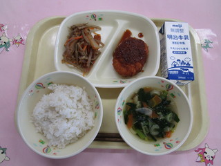 3月7日~阿久津中学校1年2組の献立~ ご飯 牛乳 ハンバーグおろしソース チョレギサラダ ゆばとほうれん草のスープ お祝いデザート (お米deお祝いケーキいちご味)