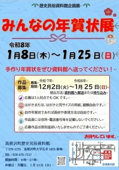 皆様から寄せられた手作りの年賀状を展示しています。一般公募で集まった、版画・絵画・貼り絵・写真など個性豊かな作品をぜひご覧ください!